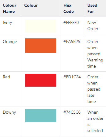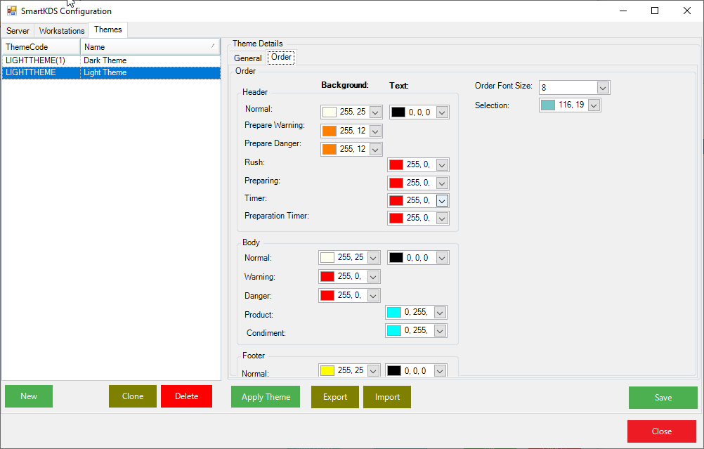 - KDS: This allows you to configure the colour of the background of the Body, Header, and Footer; it also allows you to configure the Text colour and Font Size