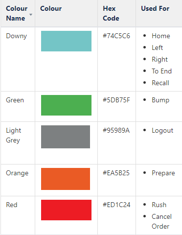 - Buttons: This allows you to configure the colour of the background of Navigation, Bump, Prepare, Rush, Cancel, Recall, Settings, and Logout