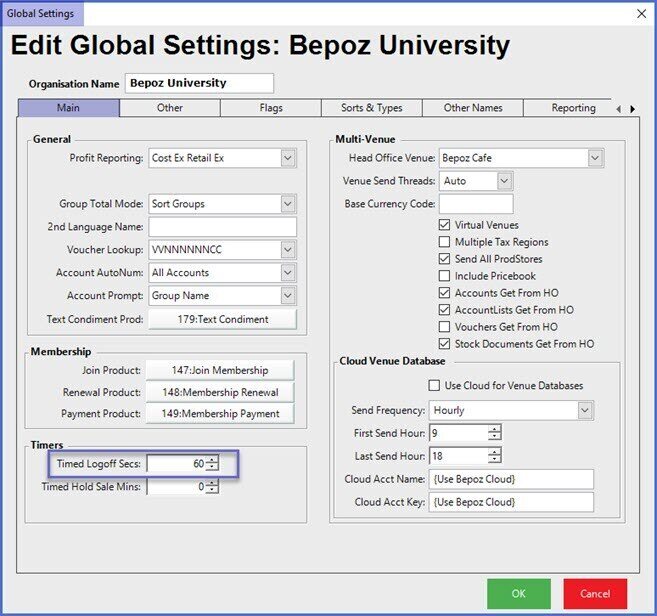 - The preset amount of time to pass for a Timed Log Off is default to 60 seconds but can be adjusted in the 'Main' tab of Global Settings