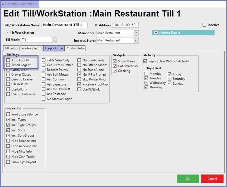 By enabling a Till Flag in Workstation Maintenance, a specific Workstation can be configured to either Auto Log Off or have a Time Log Off