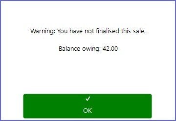 A warning prompt will display informing the Operator that the Transaction has not been finalized; tap OK to continue