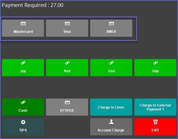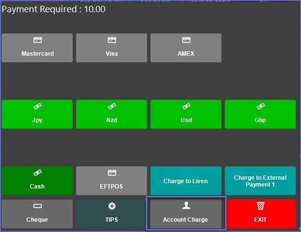 - These options include common Credit Card Types, Cash, Debit/EFTPOS, Check, and Account Charges