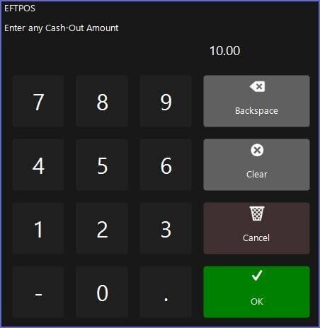 If configured, after tapping the EFTPOS Key, a prompt will appear offering for an optional Cash-Out Amount to be entered