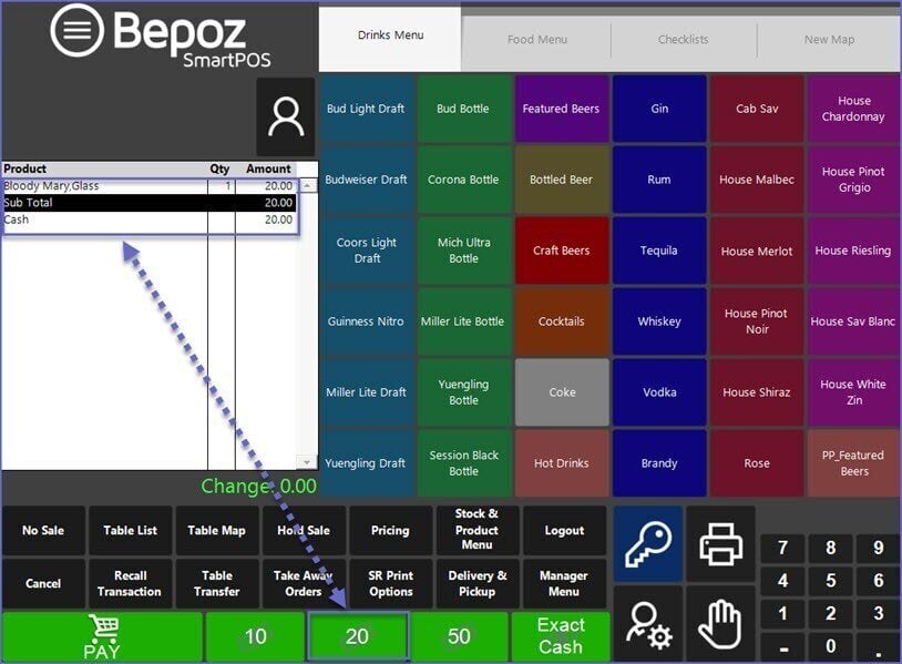 - For example, if a customer is paying using a $20 bill, the Operator simply needs to tap the "20" button; there is no need to open the Payment window