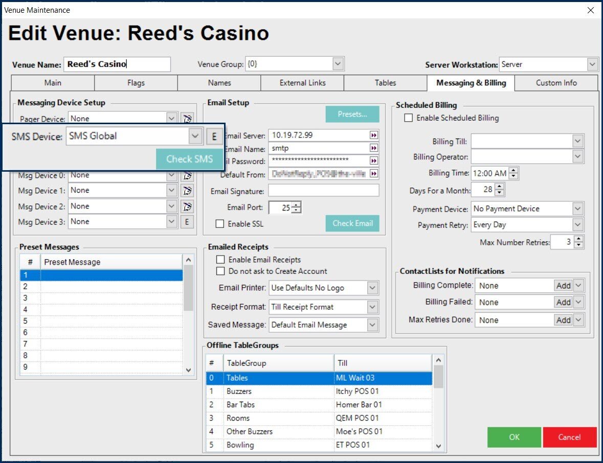 - After creating and saving the SMS Link Device, it must be set per Venue in the 'Messaging Device Setup' section of the 'Messaging and Billing' tab: