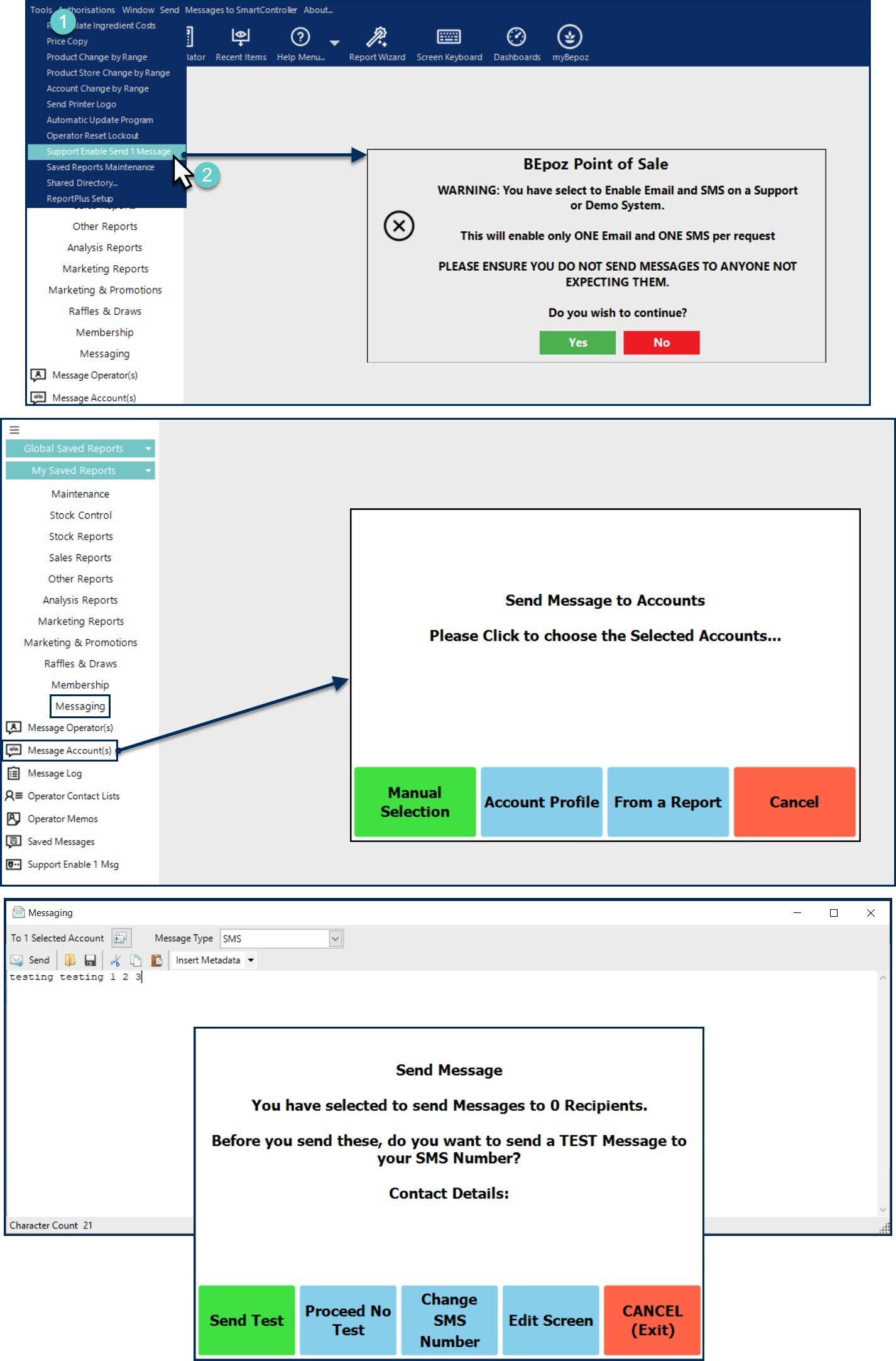 - Head to the Tools menu (top, left in BackOffice) and turn on 'Support Enable Send 1 Message'