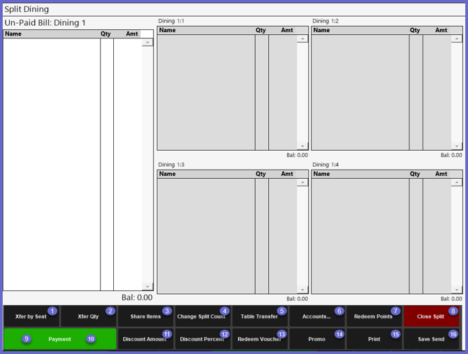 • After these changes have been applied, the user will be then presented with the Split Bill Screen and pnlSplitFunctions