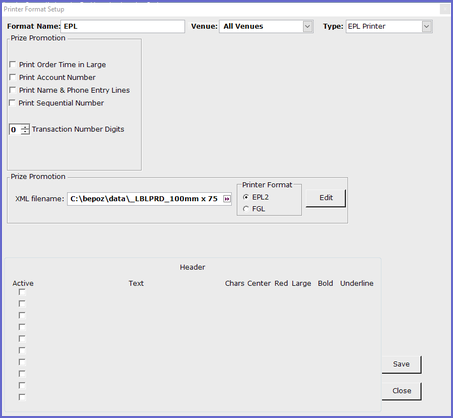 - With the selected Type, set the Printer to an EPL printer device and set the format to a valid EPL printer format