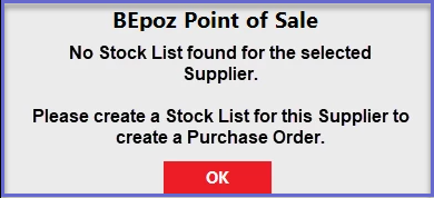 - In an instance, when the flag is ON and an Operator attempts to create a Purchase Order for a Supplier for whom there is no Stock List saved, a message will display