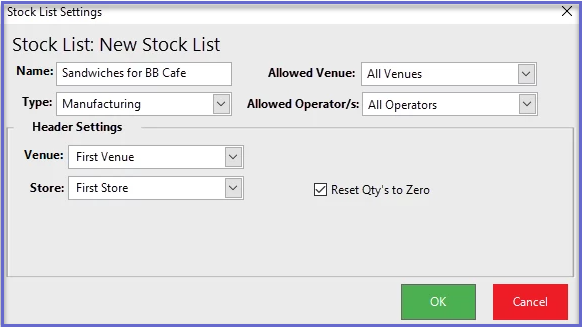- ResetQTYZero: If this is ticked, the qty’s specified from the template will change to zero (0) when the Stock List is used