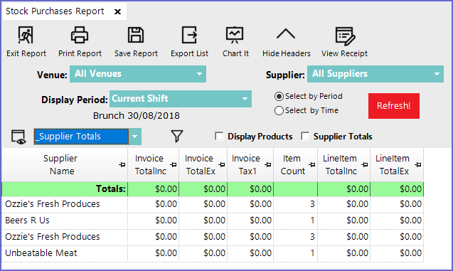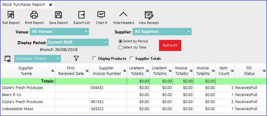 This report shows the Purchases by Supplier and can show just the Invoice Totals for all of the Products that have been purchased from the selected Supplier