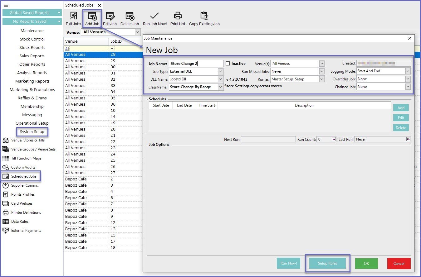 - To get started, navigate in BackOffice to System Setup > Scheduled Jobs