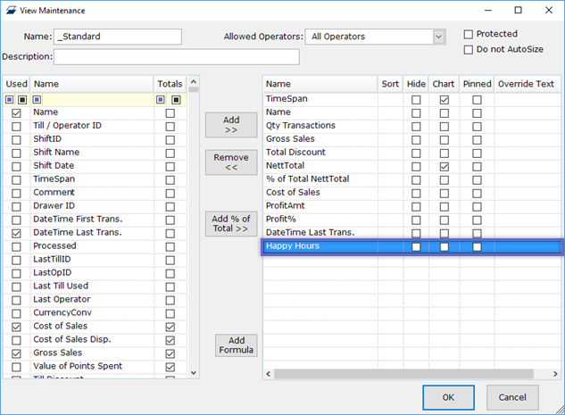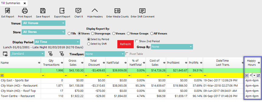- For example, the Custom Text Field called "Happy Hours" can be added to the Standard View for the Till Summaries Report