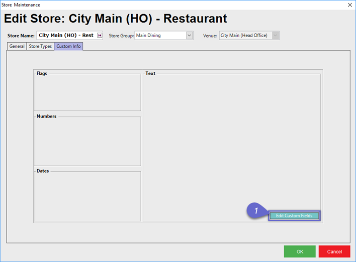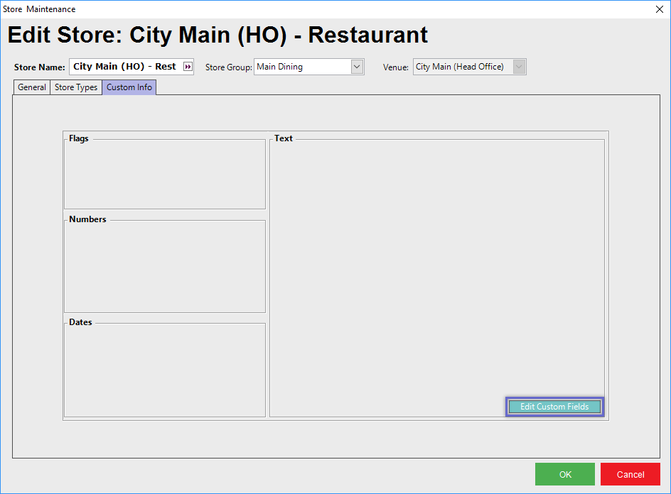 - To edit the fields in the Store Custom Info tab, click on the Edit Custom Fields button in the bottom right corner