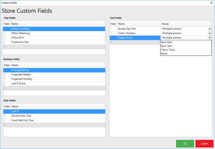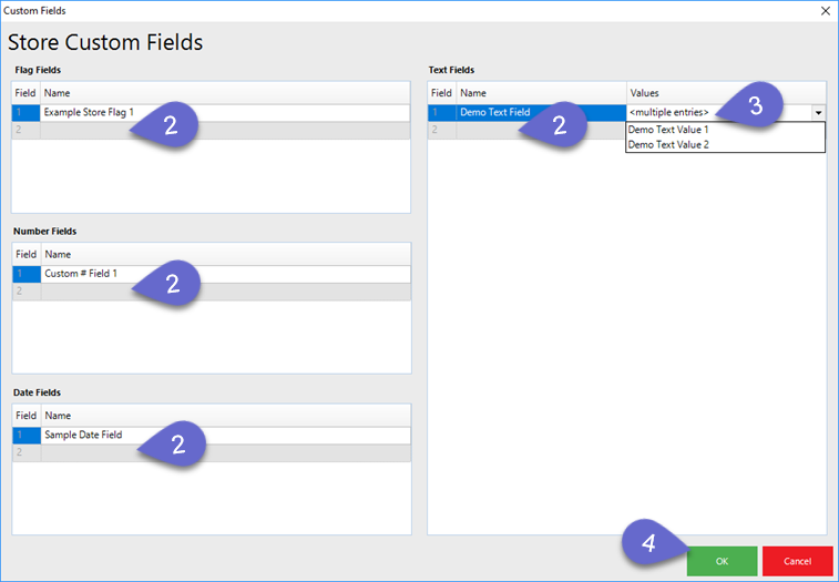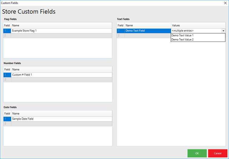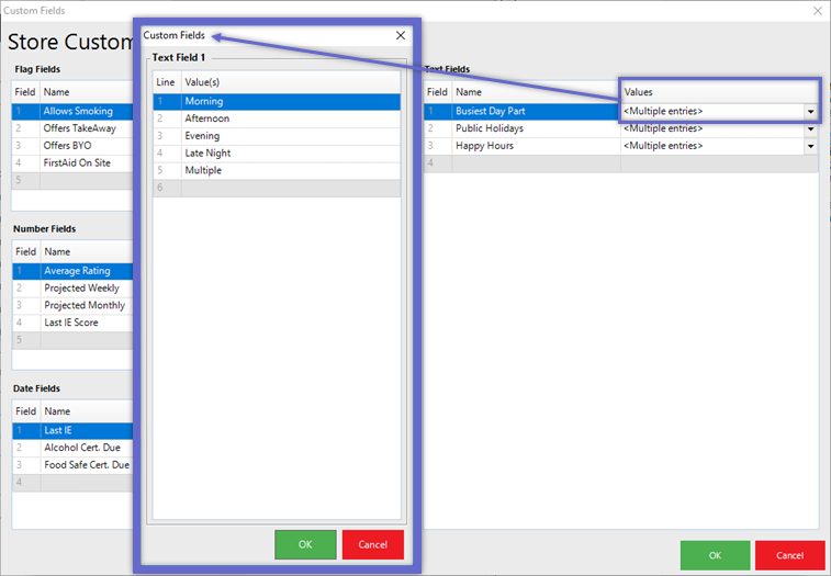 - For Text Fields, add Values to select from for each Text Field Name as well; double-click in the Value Field to open a window for Multiple Entries