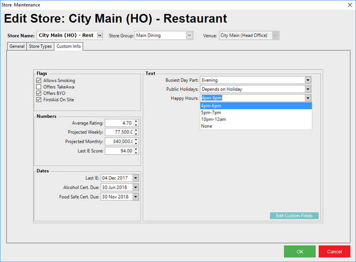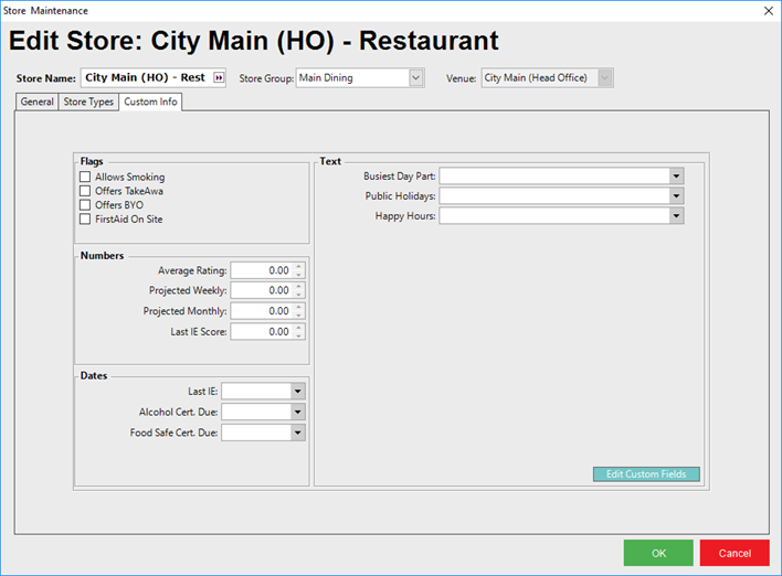 Custom Info - or Custom Fields - allow for additional configuration options to be created and set as required by the Organization for each Store.