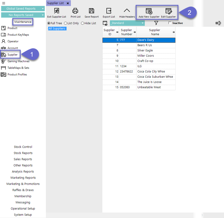 - From the Maintenance menu, select Supplier which will open the Supplier List