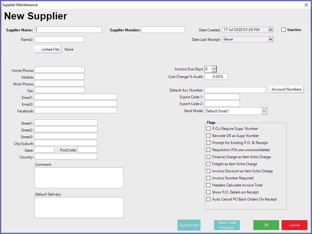 - This will open a new Supplier Maintenance window which will allow for entering the new Supplier details