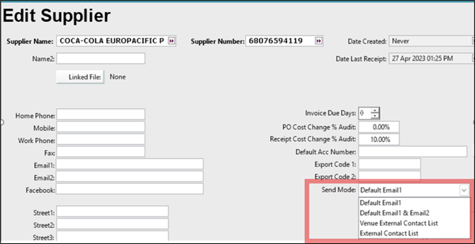 The Supplier Send Mode drop-down allows for a default option to be selected which will determine the Email Address/es that will be used when sending Supplier Communications from Bepoz.
