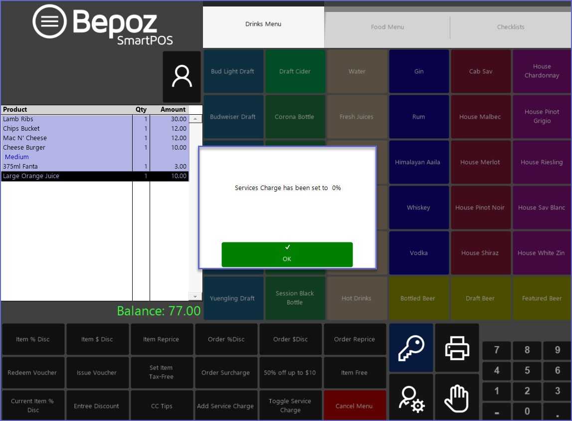 - When an Operator selects the Toggle Service Charge button, a series of prompts will display, first asking the Operator if they would like to continue and then advising the Operator that the Service Charge has been removed