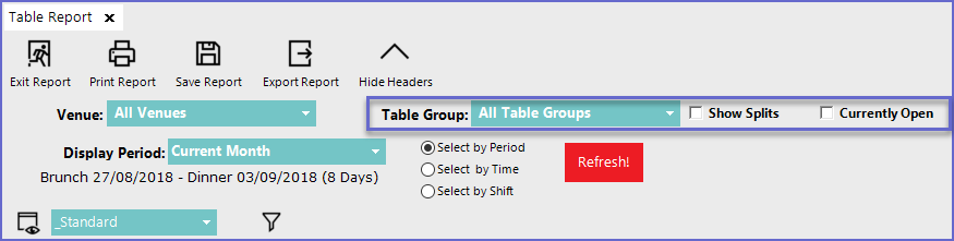The report can display individual Table Groups, or all the Tables combined.