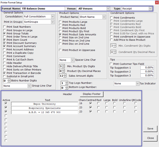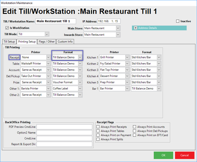 - The Till Balance Header is configured in the Printer Format Setup and then teh Printer Format is assigned to the Receipt Printer in Workstation Maintenance