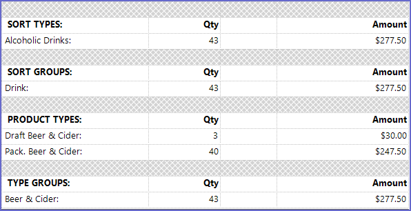- In the given example, the amount generated from Product Sort, Sort Groups, Types, and Type Groups have been displayed