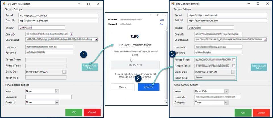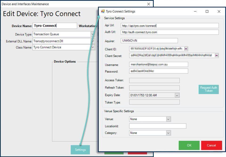 - After all Service Settings (except for the Access Token, Refresh Token, Expiry Date, and Token Type) click the 'Request Auth Token' button to connect to the Tyro server