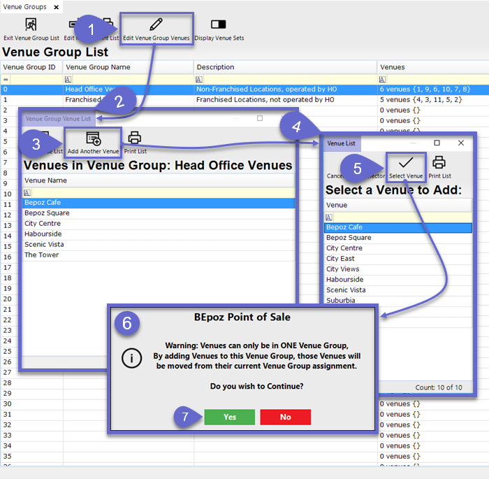 - A Warning Prompt will display informing the Operator that a Venue can only belong to one Venue Group and if the process is continued the Venue will be removed from the current Venue Group assignment