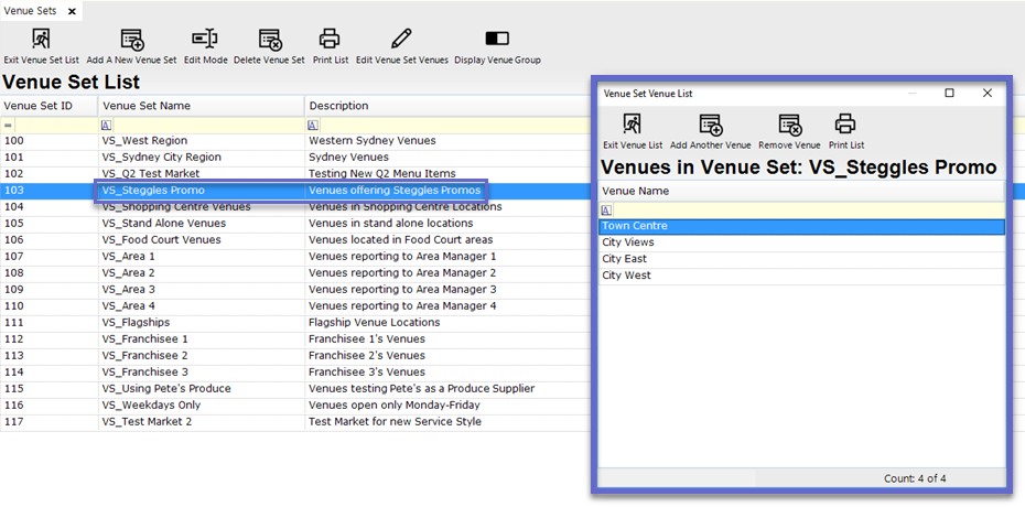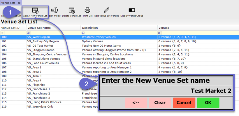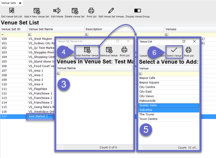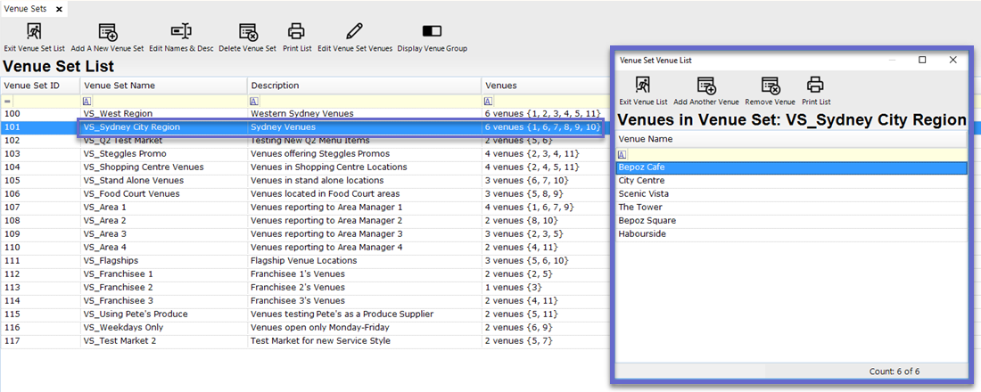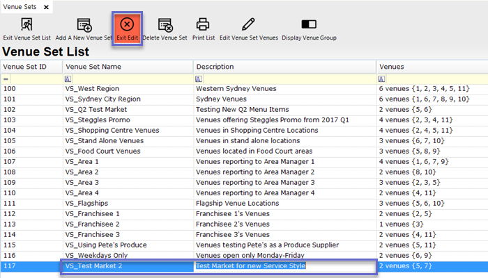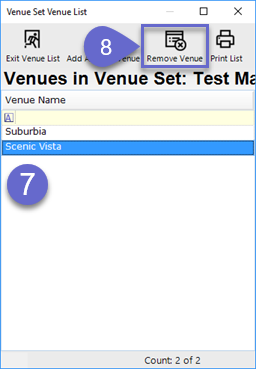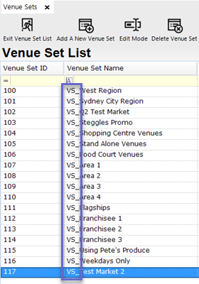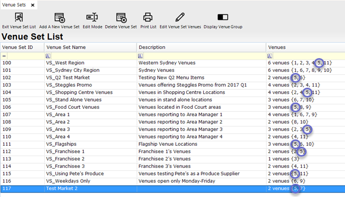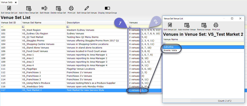 - In the above example, the "VS_Test Market 2" Venue Set contains two (2) Venues and their Venue IDs are 5 and 7; these can be verified by opening the Venue List for the Venue Set and cross-referencing with the Venue ID Numbers from the Venue & Till List