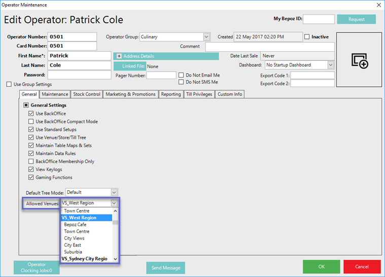 If an Operator, such as a Shift Manager, works at multiple Venues (perhaps a geographical region), the Operator's Allowed Venues can be set to a Venue Set corresponding to the geographical region
