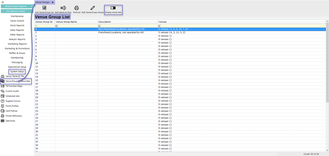 - To access the Venue Groups & Venue Sets tab, select Venue Groups/Venue Sets from within System Setup from the side menu