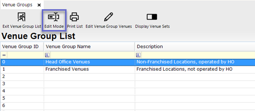 - To edit the Venue Group Name and/or Description, click the Edit Mode button at the top of the tab