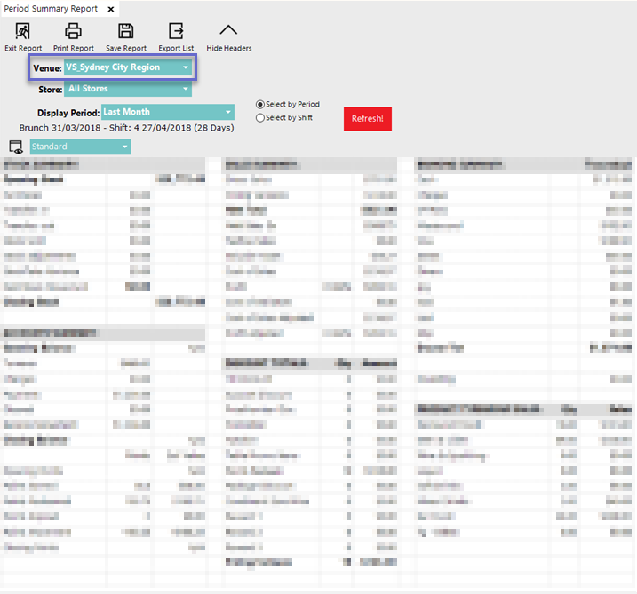 - The Period Summary Report in this example only shows data from the Venues in the Venue Set named Area 1