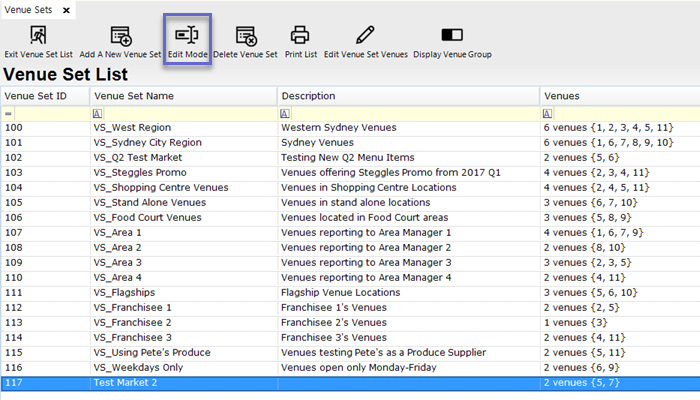 - Similar to the Venue Group List, to edit the Venue Set Name and/or Description, click the Edit Mode button at the top of the tab