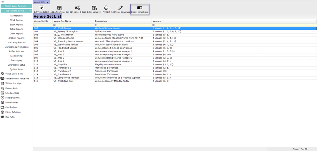 - To return to Venue Groups from the Venue Sets view, click on the Display Venue Group button