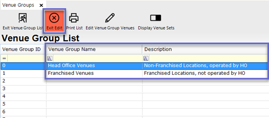 - From the Venue Groups Tab, the entire Venue List of a Venue Group can be seen by double-clicking on a Venue Group line or by highlighting the desired Venue Group and clicking the Edit Venue Group Venues button in the header