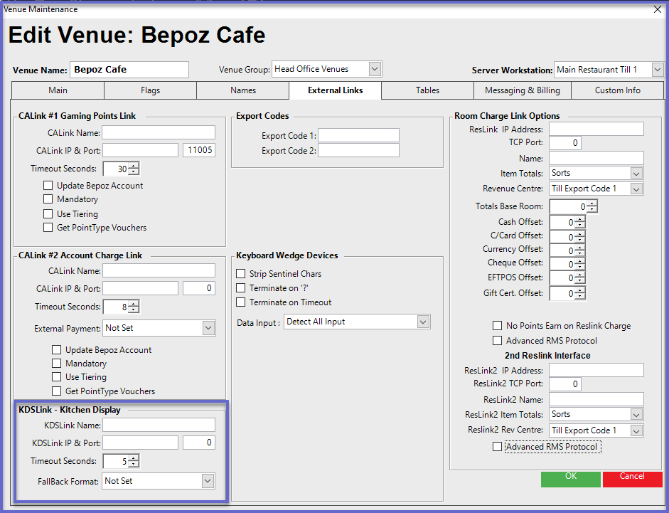 - After KDSLink is active, a section of configuration options will appear on the "External Links" tab of Venue Maintenance labeled "KDSLink - Kitchen Display"