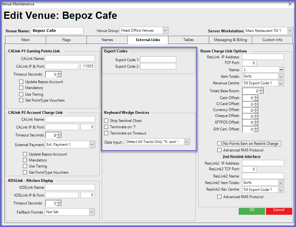 - The Keyboard Wedge Device area allows for defining and configuring the Magnetic Card Reader of the Venue's Tills if required