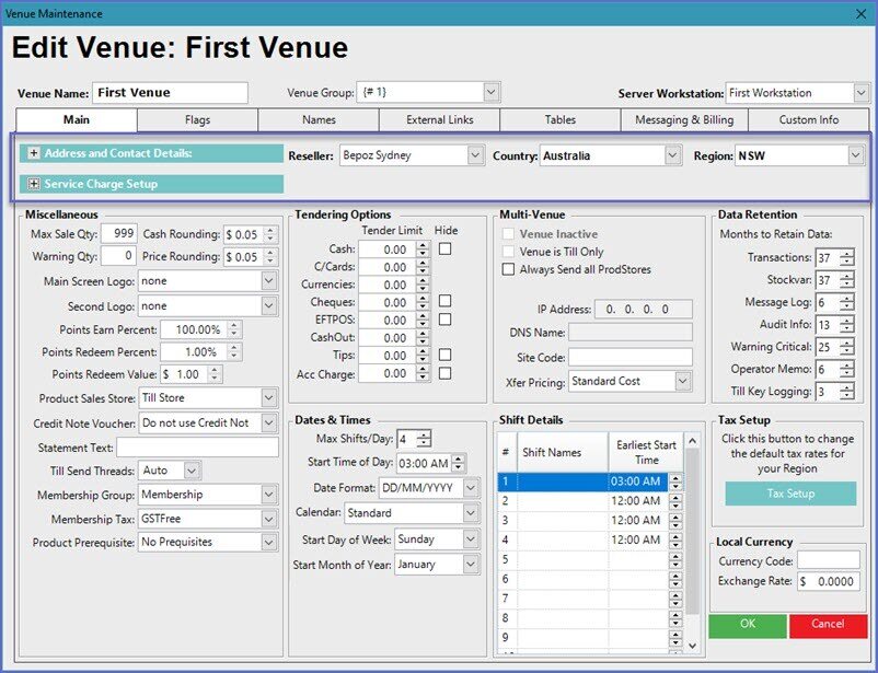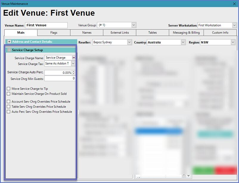 Venue Maintenance "Main" Tab - Part 1 focuses on the General settings in "Main" Tab of Venue Maintenance which hosts settings for Service Charges, Address Contact Details and Location details.