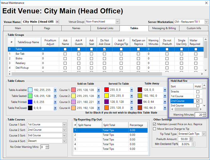 - The Hold And Fire section is used to configure which Product Sorts will automatically be Held back from Printing when an Operator Saves a Table Transaction in this Venue using the Save Table Hold Fire function