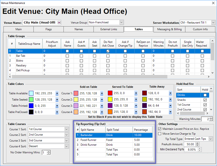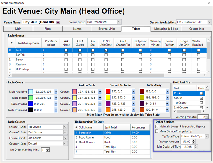 This article will focus specifically on the "Tables" Tab of Venue Maintenance which provides configuration options relating to Table Groups, Courses, and other important Table Settings.