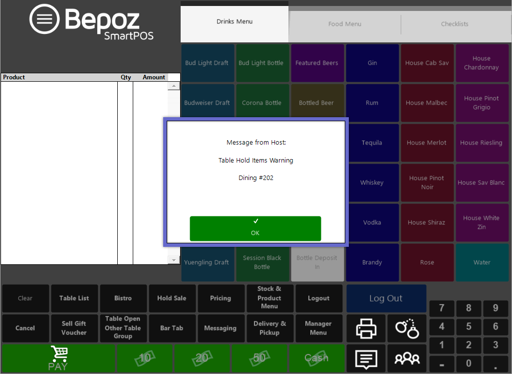 - The Warning Minutes field is used to configure how many minutes must elapse after a Transaction has been initially Saved using the Save Table Hold Fire function before triggering a prompt via SmartPOS notifying that the Products belonging to the Held Product Sorts haven't yet been Printed