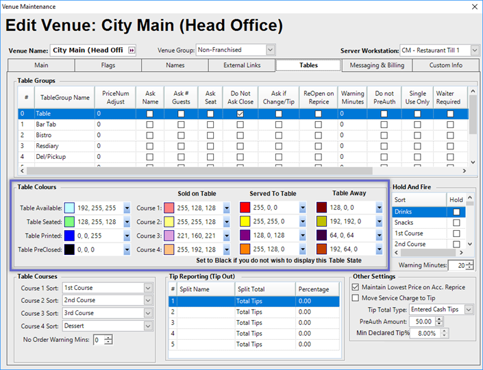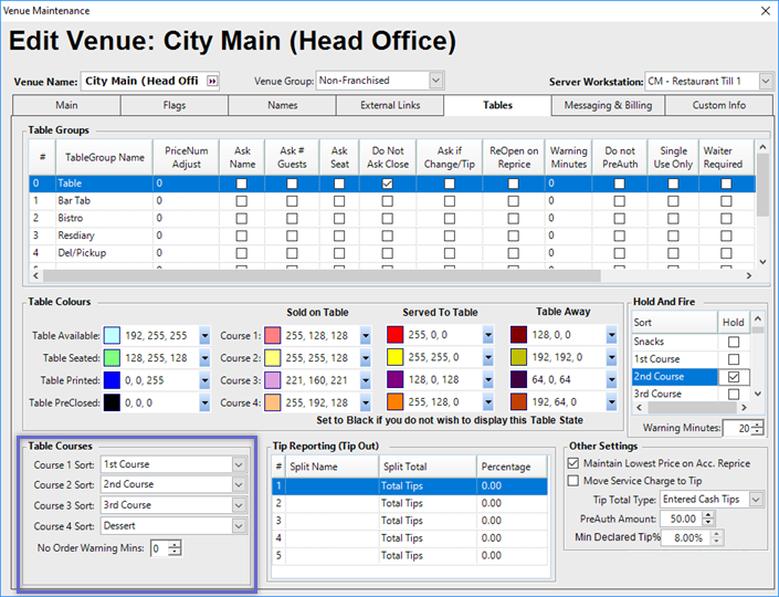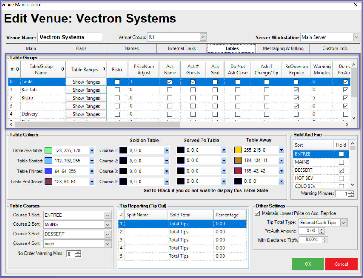 This article will focus specifically on the "Tables" Tab of Venue Maintenance which provides configuration options relating to Table Groups, Courses, and other important Table Settings. Prerequisites