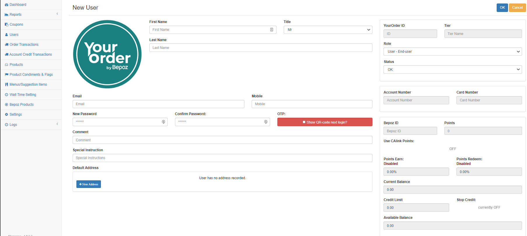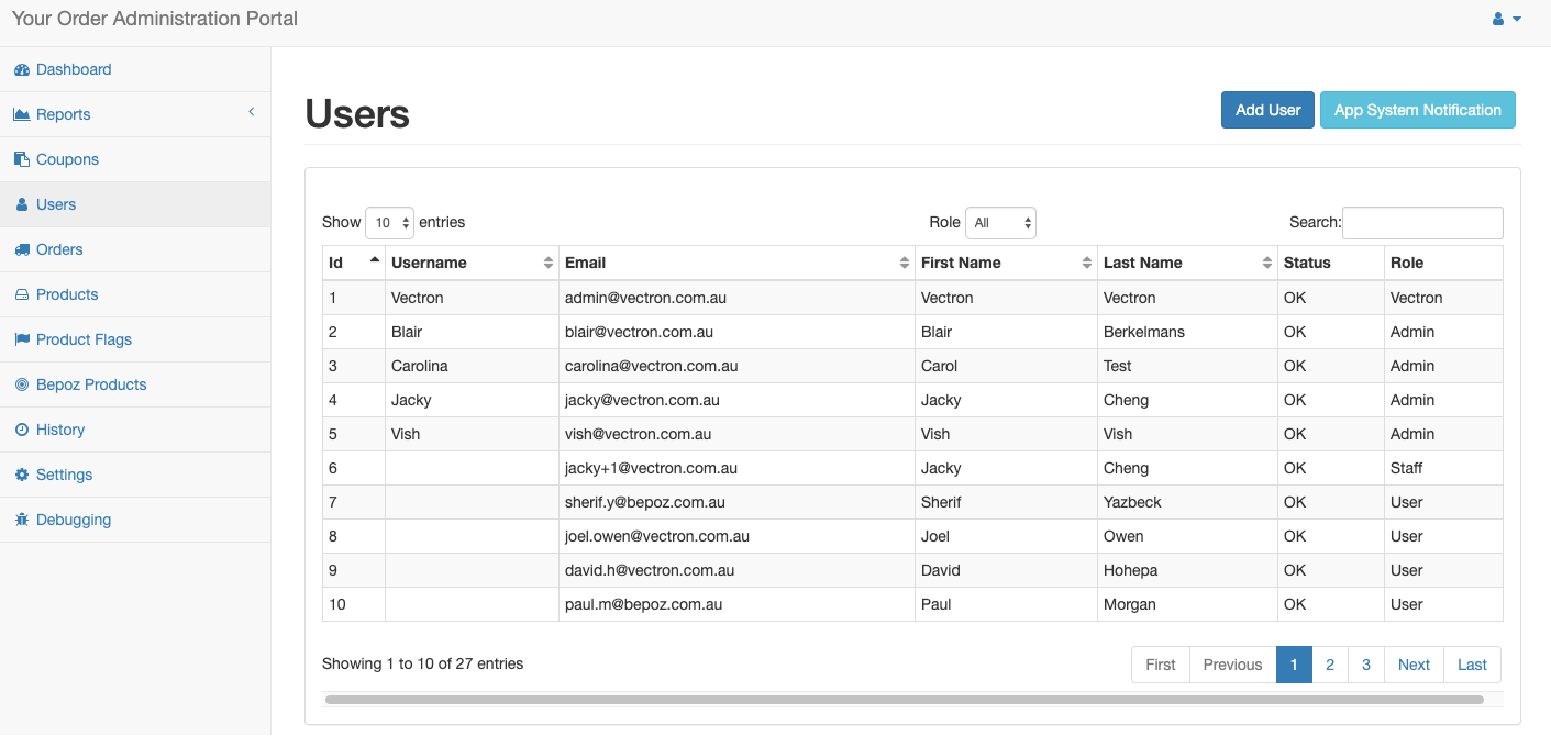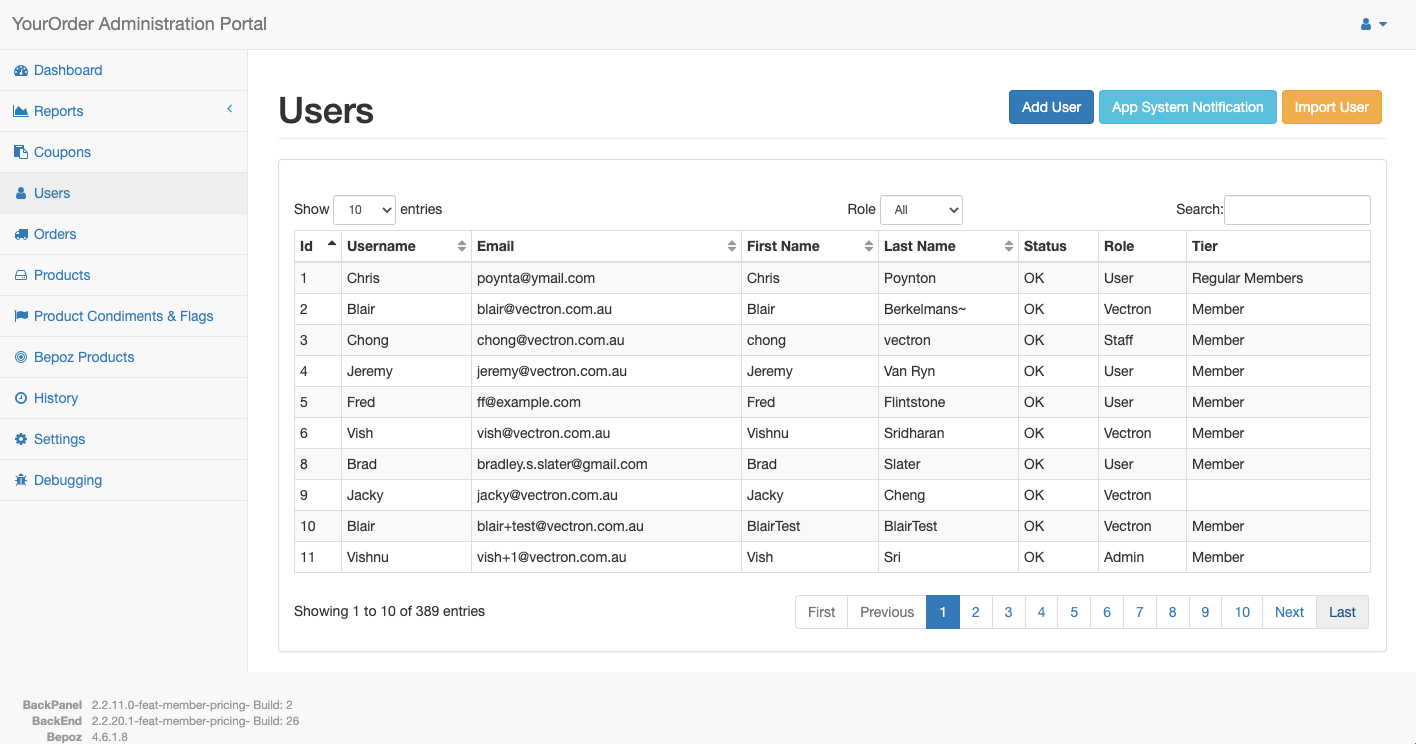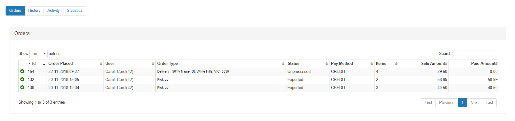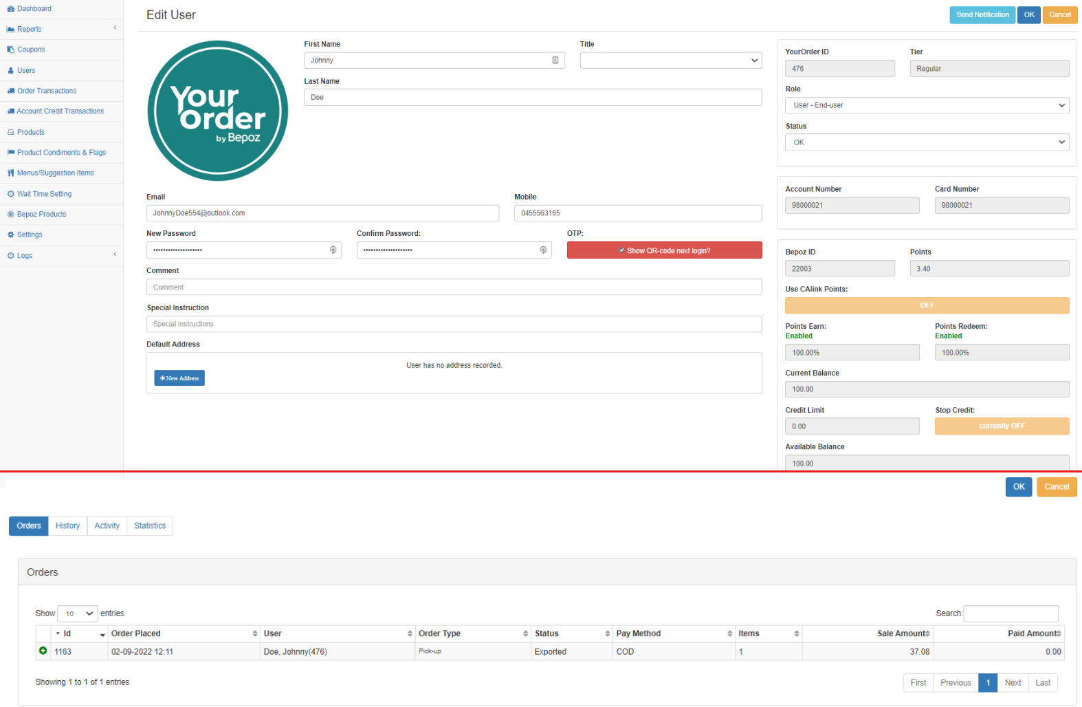 Here you can see a list of customers who signed up in YourOrder, customers that have been added through the Admin Backpanel, and also the Staff members.