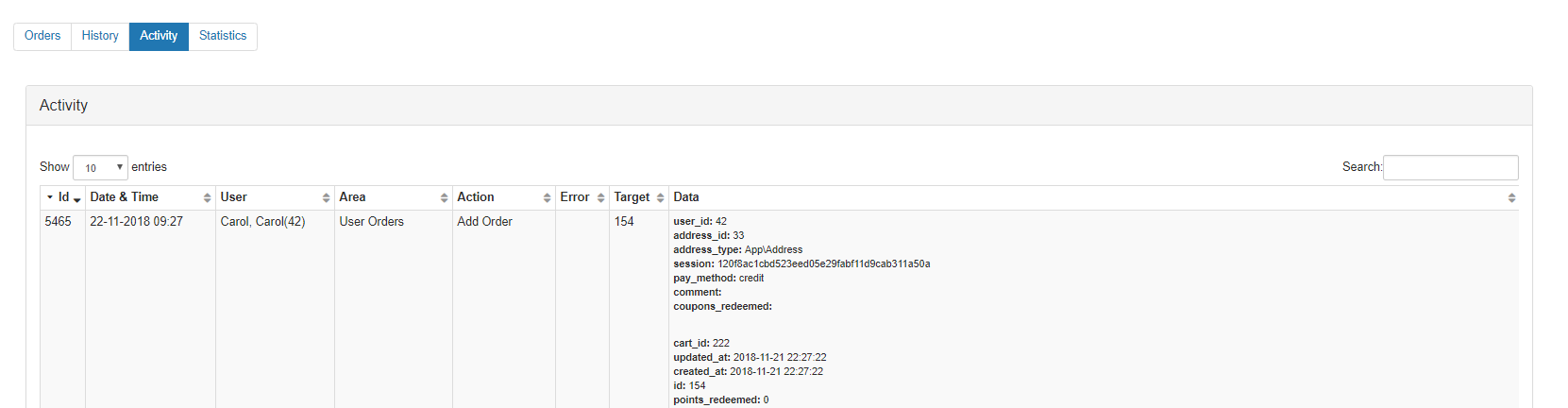 Here the Backpanel users can see details of this customer’s activity on the website, e.g. when they add a product to the cart, remove item(s), change the quantity, etc.
