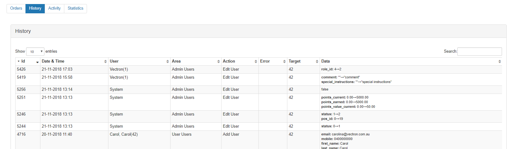 Here the Backpanel users can see all the changes that have been done to this customer’s account, including personal information changes, such as their name, email, phone number, etc.