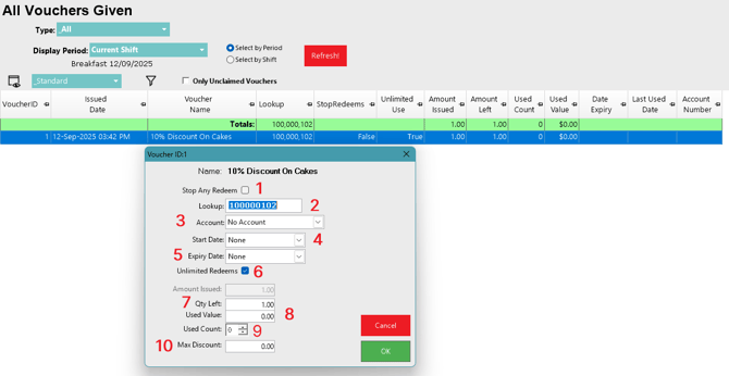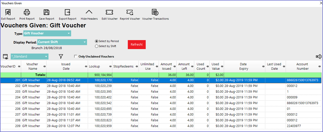 Clicking on the button will open a Vouchers Given Report which will list all the Vouchers for a specific time period; be default this will show for the Current Shift