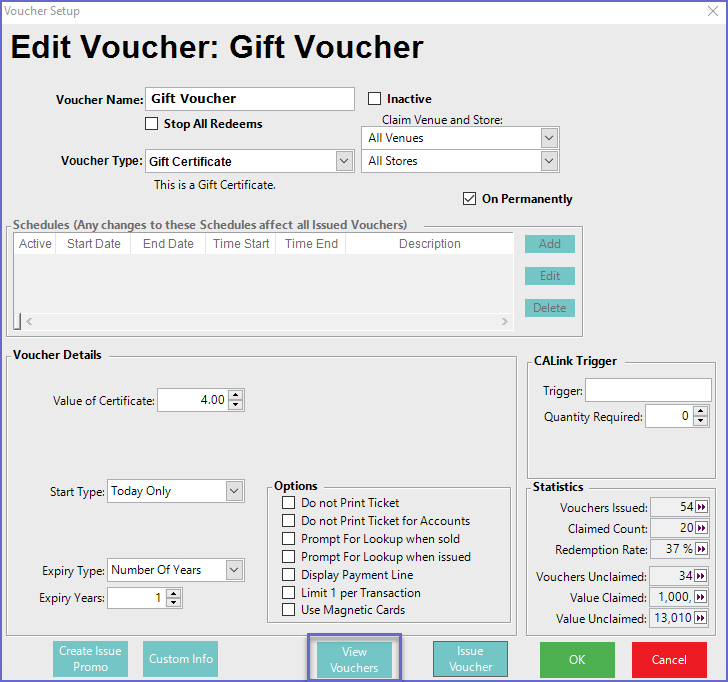 - The Vouchers issued can also be viewed from the Voucher Setup by clicking on the 'View Vouchers' button at the bottom of the Voucher Setup window