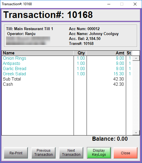 - With the full Transaction Journal, double-clicking on any Transaction will display a receipt format where operators can analyze the KeyLogs for that particular transaction